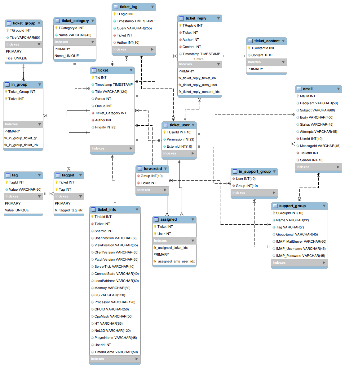 Quite central you can see the ticket table. As you can see, a ticket has a ticket_category field and author field, these hold the id of the related row in the ticket_category and ticket_user table. There's also the relation between a ticket and it's log entries, this is done by the ticket foreign key in the ticket_log table. The same counts for most other tables that are related to the ticket, they all got a ticket column used as foreign key.