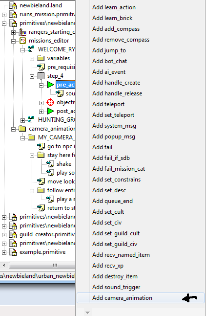 Now that we've created our camera animation called MY_CAMERA_ANIMATION we have to add it in a mission as a pre action and/or a post action. To do so, just create or open a mission and do a right click on the pre_actions or post_actions node. Then you can choose: Add_camera_animation to add a camera animation.